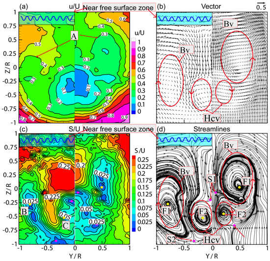 Figure 4d, labeled D) being transferred through an intense longitudinal bilge vortex towards the center of the hull, which reduces its velocity and creates local hook-like structures. The bilge vortices formed by the flow passing through the stern of the U-shaped ship move down, which is almost in parallel with the hub cap vortices. The position of the hub cap vortex changes a little; however, the rotating range is larger than the design condition. The cross-flow vector and streamline clearly capture and illustrate the characteristics of the bilge vortex and the hub cap vortex.