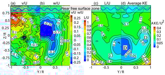 Figure 4c,d shows that the hook-like region of the wake field in the propeller disk area has lower average kinetic energy (AKE) (labelled D in