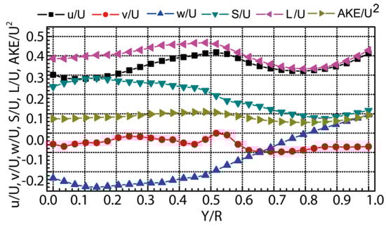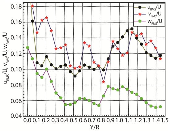 Figure 10 depicts the root mean square velocity profiles at Z/R = 0.00 under the ballast condition, which is a quantitative expression of the distribution of the turbulent fluctuating velocity field. The results show that the dimensionless turbulent fluctuating velocity first decreases, then it increases, and it finally decreases from Y/R = 0 to Y/R = 1.