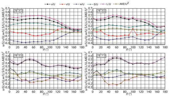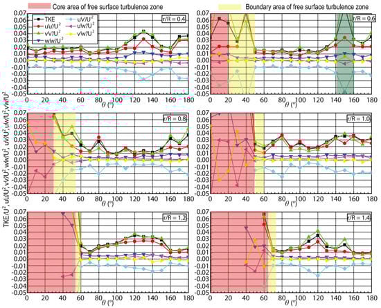 R = 0.6–0.8, which is located in the low-kinetic-energy region, the TKE and Reynolds stress are relatively stable as the circumferential angle increases. In the circumferential distribution area with