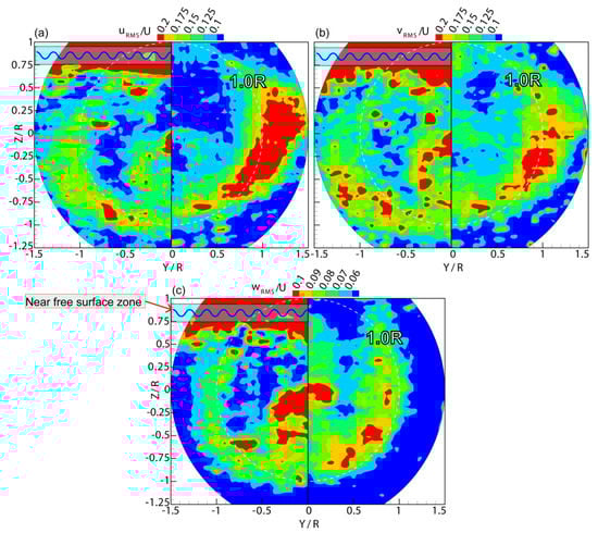 Figure 7a–c displays the results of the dimensionless axial root mean square velocity