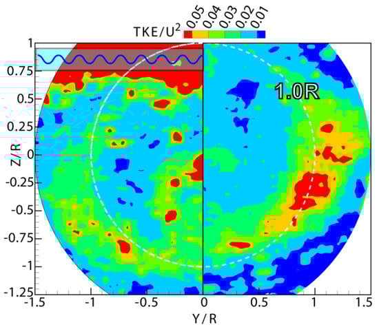 Figure 8, the distribution of the TKE is also U-shaped; however, the interval is wider and the U-shaped distribution is concentrated in the kinetic energy change layer, which is the transition from low kinetic energy to high kinetic energy. Compared with that under the design condition, the changing layer with strong gradient of the turbulent kinetic energy under the ballast condition is outward-transferring to 0.9R. Due to the influence of the loading condition, the shaft is no longer in the hydrodynamic downstream state under the ballast condition. Therefore, the TKE at the end of the shaft in the non-downstream state has a large amplitude. As demonstrated in