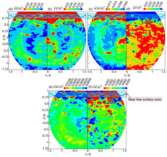 Figure 11 displays the turbulence statistics at Z/R = 0.00 under the ballast condition. The dimensionless Reynolds normal stress