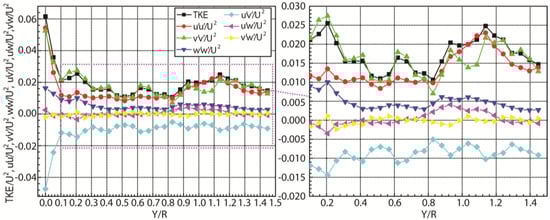 TKE/U2 show an overall decreasing distribution from Y/R = 0 to Y/R = 1. The dimensionless Reynolds shear stress