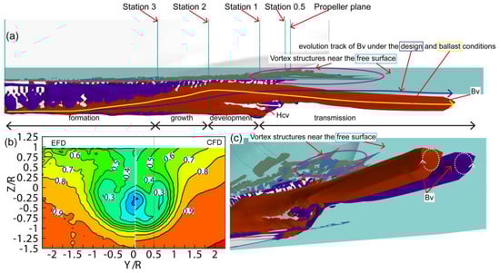 Figure 14a,c is the global evolution and close-up view of the vortex structure, under the ballast condition. In addition to the bilge vortex and hubcap vortex similar to the design one, there are also vortex structures near the free surface caused by fluctuations of free surface. In addition, the evolution trajectories of the bilge vortex and the hub cap vortex in ballast are different from the design ones.