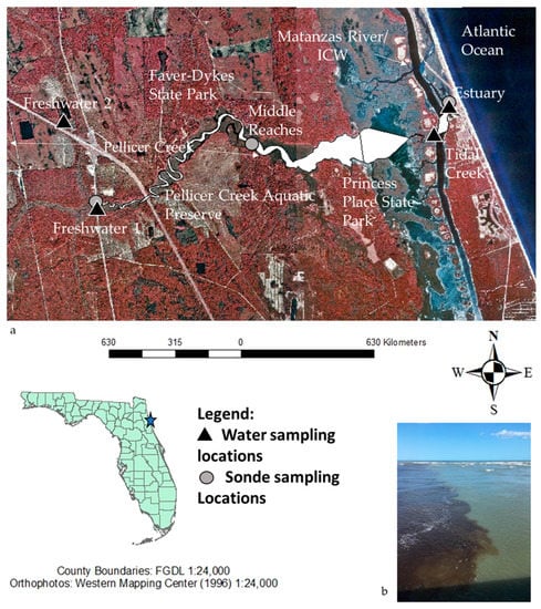 - Dix, N.G.; Phlips, E.J.; Gleeson, R.A. Water Quality Changes in the Guana Tolomato Matanzas National Estuarine Research Reserve, Florida, Associated with Four Tropical Storms. J. Coast. Res. 2008, 55, 26–37. [Google Scholar] [CrossRef]