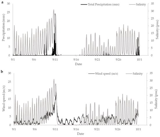 Wind speed (a) and precipitation (b) measurements taken during the month of September at the middle reaches site and the effects on salinity concentrations within the study site. The spike in precipitation and wind speed indicates the time of impact from Hurricane Irma on the study site.
