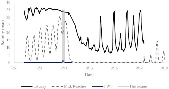 Salinity graph showing fluctuations at the three sonde locations for before, during, and after Hurricane Irma. Salinity values within the estuary (black line), middle reaches (dashed grey line), and freshwater 1 (solid grey line) 2 days before Irma, during the storm (grey bar), and 1 week after the hurricane had passed.