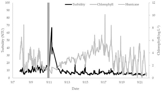Turbidity levels began increasing during the hurricane, peaked immediately after it passed, and remained elevated for approximately 2 days after the hurricane made landfall in the St. Augustine area (Figure 4). Chl-a levels decreased substantially just prior to the storm and steadily increased after the storm once turbidity levels began to drop. However, turbidity and Chl-a were not significantly correlated (rs = −0.07, p > 0.05) suggesting that other factors such as pulses of nutrients during and/or after the storm enhanced aquatic primary production.