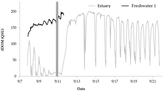 Data download was conducted manually from the sondes at the estuary and freshwater 1 sites on 22 September, however the freshwater 1 sonde malfunctioned and only logged data from 7 to 12 September. The estuary sonde collected data from before the storm (7–10 September), during the storm (10 September, 8 p.m. E.T.–11 September, 1 a.m. E.T.), and after the storm until the sonde was removed from the waterway (11–22 September). Surface water discharge data was downloaded for the middle reaches and is posted publicly on the United States Geological Survey’s national water information system website (Figure S1; unpublished data) [].