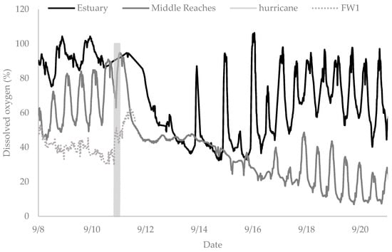 Measured fluctuations in dissolved oxygen across the study site. The estuary and middle reaches sites data spans from 3 days before to approximately 10 days after Hurricane Irma. DO data from the freshwater 1 site is shown for the first few days of deployment before the sonde malfunctioned post-storm.
