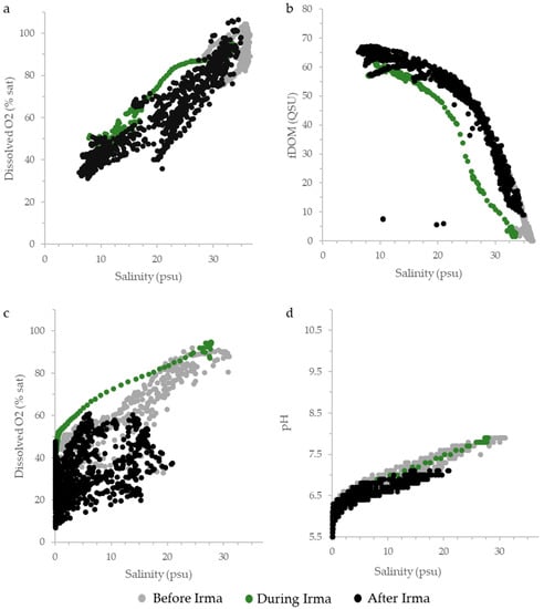 Correlations from before (grey), during (green), and after (black Hurricane Irma compared for a series of parameters: (a) dissolved oxygen and salinity within the estuary, (b) fDOM and salinity at the estuary, (c) dissolved oxygen and salinity in the middle reaches, (d) pH and salinity in the middle reaches. This data was collected by YSI data sondes from 7 September to 22 September 2017. * Hurricane Irma affected the study area between 10 and 11 September 2017.