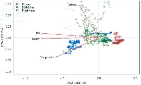 Principal component analysis (PCA; ‘factoextra’ R-library) was used to compare salinity, DO, temperature, and turbidity collected at all three sites by data sondes. PCA was performed to determine how closely the parameters were related at these three sonde locations.