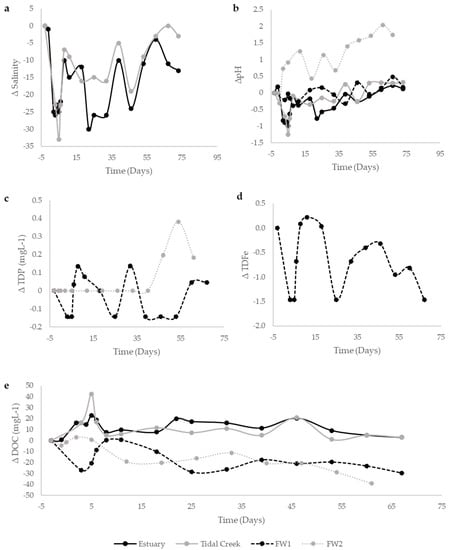 Measured concentrations for changes in (a) salinity, (b) pH, (c) total dissolved phosphorus, (d) total dissolved iron, and (e) dissolved organic carbon at estuary, tidal creek, freshwater 1, and freshwater 2 locations from initial concentrations (collected on 7 September 2017). All values were normalized to time point 0 values to display the differences from initial conditions over time. Salinity was 0 psu across all measured time points at freshwater 1 and 2 sites, and total dissolved phosphorus and iron concentrations were below the minimum detection limit at the estuary and tidal creek locations. Hurricane Irma passed through the study site 3 on day 3 of the study.
