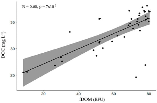 Additionally, a Spearman’s rank correlation was performed between fDOM and DOC data in R package “ggpubr” collected on 22 January 2018 at 20 locations at both high and low tide across the study site in order to assess how fDOM relative fluorescence relates to DOC within this system. This relationship can be used to link fDOM to DOC (and indirectly DOM) concentrations during sonde deployments since water sampling was not possible at the same interval as the sonde measurements. Even though fDOM is only a small fraction of total DOM, fDOM is used as a proxy for the changes in DOM concentrations within the study site since it was not possible to measure total DOM continuously on the same timescale.