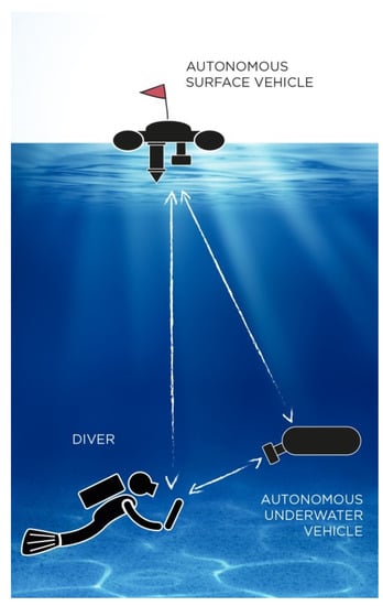 The CADDY project concept demonstrating the relation between two unmanned vehicles which collaborate with a single diver. Adapted from [], with permission from IEEE, 2015.