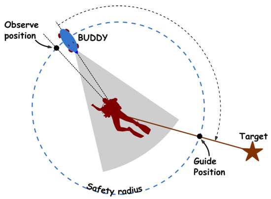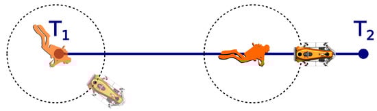 Among the first autonomous robots for diver–robot interaction is the AquaRobot [] where the on-board camera image is analysed to recognize diver motion and subsequently used for underwater diver tracking []. The problem of AUV manoeuvring in presence of divers is investigated in []. In an environment with potentially multiple divers, the AUV uses reactive and deliberative control strategies to achieve manoeuvring without collisions. Diver following in a simulated environment, with sonar based diver detection, was researched in []. Same authors have shown, on real-world results, the feasibility of diver detection and tracking using sonar images []. Guidance of people through the environment has been mostly studied in land robotics applications. Museum tour-guide robots are among the first to tackle the problem []. They move in complex environments and need to handle cooperative and uncooperative agents, but the solution are not easily transferred to underwater situations. Sadly, when it comes to underwater robots it is hard to find guide or navigation aiding robot examples. Even examples of diver following are scarce []. Therefore, the research has to be compared with land applications which is problematic. Guide and following robots in land applications allow for more freedom of movement, i.e., do not necessary maintain close formation, which is wanted in a diving buddy.