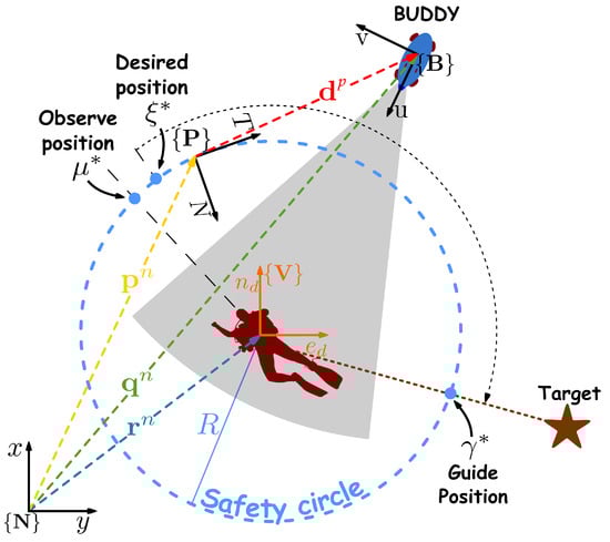 Vector and frame definitions in the diver–robot pair. Main operation includes initial vehicle convergence onto the safety circle followed by convergence to the desired position on the path. Adapted from [], with permission from IFAC, 2016.