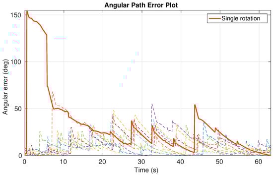 The rotation phase begins with the diver rotating in steps of roughly or while BUDDY needs to follow. Summary results of nine rotation experiments and their average, are shown in Figure 11 and Figure 12. The circular path error is shown in degrees representing the arc angle between the desired and actual value. This representation was selected since it is easier to interpret than actual path error length, i.e., the length of the arc. The diver heading measurements are updated every 5 , hence, is update at the same rate as is evident on Figure 11. Note that the diver rotation is hard to estimate reliably with such sparse measurements, i.e., the diver’s rotational speed is easily underestimated.