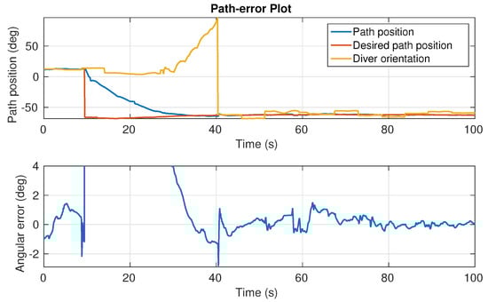Assuming sensor data is available, the selected control approach can be easily extended in future to better integrate diver–robot interaction aspects. Relating to this, the extensions to guiding and path choice can be discussed. The demonstrated navigation aiding scheme used the vehicle as a pointer towards the target. This can be referred to as the pointer strategy. This strategy depends on the availability of the diver’s and target’s positions. Since diver position is acquired from multiple sensors, this strategy is robust and directly available. The drawback of this strategy is that the vehicle might position itself behind the diver when the diver is uncooperative and not moving towards the target. Higher-level data collection might require monitoring the diver frontally making the pointer strategy problematic. This is also a problem from the divers perspective as divers prefer the vehicle to be in front. The vehicle, as a fixed point, represents a stable reference for the diver in low visibility or when the bottom is not visible. To ensure guidance while remaining in front of the diver at all times, a second strategy will be introduced in future work. The turn signaling strategy positions the vehicle in the diver’s FoV at all times. Guidance is achieved by positioning the vehicle either to the left or right of the diver’s FoV depending in which direction the target is located. This extension does not require changing of the controller, but rather defining the set-point as