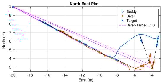 Once rotation is complete, the tracking phase is started. During this phase the diver moves along a straight line from to . The result is shown in Figure 13 and Figure 14. BUDDY stays in front of the diver as desired during the tracking phase. The relative range and bearing, shown in Figure 14, are within similar margins as during the rotation phase.