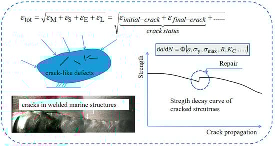 There have been a lot of researches on crack growth rate models since the Paris law being put forward [9]. The expression of Paris law is da/dN = C(∆K)n. In this expression, a is the crack depth or length; N is the number of stress cycles; C and n are parameters related to materials; and ∆K is stress intensity factor range. From then on, a new method to estimate the crack growth life is provided for fatigue research. Based on this, the damage tolerance design is developed, which makes the two disciplines of fracture mechanics and fatigue gradually combined. Although Paris law has been used widely in engineering because of its simple expression, it can only express the stable stage of crack growth, so it needs to simplify the analysis conditions in engineering application, and many later models have insufficient ability to explain various fatigue phenomena. In 2011, based on the quantitative analysis of various influencing factors [10,11,12,13], the authors put forward a unified fatigue life prediction method for marine structures [14]. In the following ten years of research, further improvements of this method on explaining more phenomenon have continued [15,16,17,18,19,20,21,22] and various applications of this method have been carried out [23,24,25,26,27,28,29,30]. Figure 1 gives a schematic presentation of the unified fatigue life prediction method. Firstly, the error sources in the process of fatigue life prediction are divided into four aspects: material (M), structure (S), environment (E), and load (L). When the model is used to calculate the fatigue life, the initial and final states of cracks should be clearly specified. These two states are closely related to the above four aspects. Then the unified crack growth rate model includes crack parameters, material strength, fracture parameters, load ratio, environmental parameters etc. In the follow-up study, the author’s research group has expanded the research on the influence of overload/underload effect [15,16], load sequence effect [17,18], small crack effect [19,20,21], creep effect [22], and other factors. With the improvement of the model, its ability to explain the phenomenon is stronger, and it can accurately predict the decay pattern of structural strength with crack growth, so as to be applied to the safety assessment of the structure and the formulation of maintenance and repair cycle. These methods have also been used to evaluate the crack growth of ship structures, offshore structures, and pressure hulls [17,18,31].