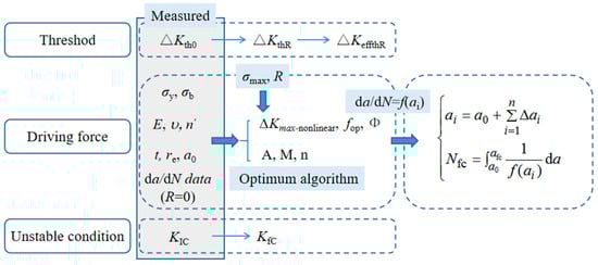 The main components of this model can be divided into three parts, namely, crack growth threshold condition, driving force, and unstable growth condition, as shown in Figure 3. Since the crack closure factor fop is included in the driving force, the threshold value ∆Kth obtained in the test is also converted into the effective threshold value ∆Keffth in the driving force calculation.