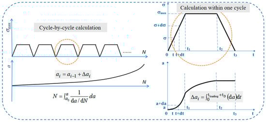 The above cycle-by-cycle calculation model takes the amount of crack growth after each cycle as the minimum growth unit, and adds the influence of creep into it, the accuracy of which has been validated [22], but it is too rough for the situation in which a single cycle with a relatively long load-sustaining time exists. In order to ensure the safety of underwater equipment during one single operation, it is necessary to consider the crack growth within a load cycle. Under this circumstance, the da/dt model for crack growth calculation in a small time domain is suitable.