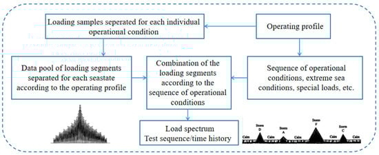 The loads on marine structures, especially on ships, are very disorderly. However, the prediction of fatigue life is based on the future’s load history. Compared with the deterministic load history in the past, the randomness of assuming the future’s load is very large, which is generally based on an observation and reasonable simplification on the past loading history [17,18]. The most realistic method is to generate a standardized loading history (SLH) for practical application based on a short-term measurement as shown in Figure 5 [18].