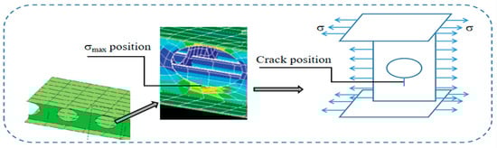 Generally, the static analysis of the whole ship structure should be carried out first to determine the principal stress distribution, and the load should be based on the position of the local structure to be analyzed. Ref. [17] introduces the process to predict fatigue life prediction method of a typical ship structure. Hot spots can accordingly be determined as the crack-prone positions. As a typical double deck structure of a pipe-laying ship shown in Figure 6, an edge-through crack is prone to be initiated in its hot-spot position around the lighting hole.