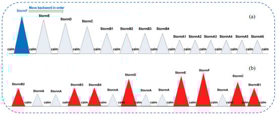 According to Equation (1), the parameter Φ is used to consider load sequence effect, overload effect, or underload effect. The fatigue crack growth with effect of different storm severity can be calculated considering variable positions of some severe storms as shown in Figure 7a. The different location of storm F will affect the final calculation results.