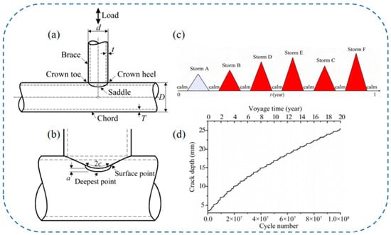 (a) A typical tubular T-joint under brace tension; (b) a surface crack initiated from the saddle position of the T-joint; (c) standardized load-time history; (d) fatigue life prediction based on SLH and UFLP [18].