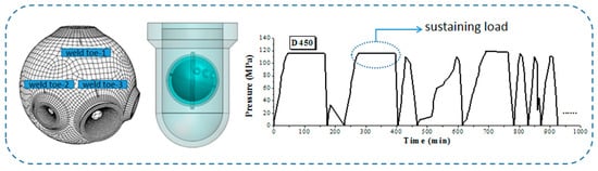 With the development of marine technology to the deep sea [38,39], underwater pressure hull has become a typical marine structure, such as the manned cabin of a manned submersible under external pressure. The authors’ group has done a lot of research on the life-related research of deep-sea pressure hulls [47,48,49,50,51,52,53,54,55,56,57]. In addition, the deep sea environment simulator is also a kind of pressure structure (called ultra-high-pressure chamber), which is affected by internal pressure. As shown in Figure 9, the pressure hull under external pressure and the simulator under internal pressure will endure variable loading history. The load history shown in Figure 8 is the actual recorded data during the pressure test in laboratory environment. The test process is similar to the real service process, most of the pressure segments are slowly pressurized to the design depth (design pressure), and then the load is maintained for a period of time to simulate the operation process at a fixed depth, and then unload. However, in the laboratory, it may not be possible to maintain the load time to reach the underwater operation time in actual service of the equipment. As a high-pressure equipment, the material for the chamber generally has good comprehensive performance, which is usually manufactured by 20MnMoNb steel. The dimension will be increased with design pressure value. For example, the chamber in Figure 8 is with the inner diameter of 450 mm and the outer diameter of 890 mm, which is designed for simulating the full ocean depth environment with pressure of 115 MPa. As a high pressure structure used in the laboratory, its safety requirements are more stringent than other pressure vessels. Internal pressure vessel is very sensitive to crack because of the tensile stress. Fatigue life analysis based on fracture mechanics will be a satisfactory tool. As described in the previous sections, the existence of the sustaining load may affect the crack growth, but the extent of the influence is related to the performance of the material itself. To use UFLP for analysis, it needs considering the effect of sustaining load on crack growth performance of the material.