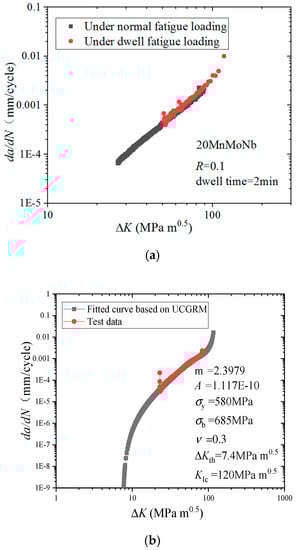 (a) Crack growth rate curves (da/dN~K curve) under normal fatigue loading (triangular load history) and dwell fatigue loading (trapezoidal load history); (b) crack growth rate curve simulated by UFLP with model parameters [56].