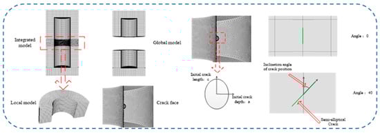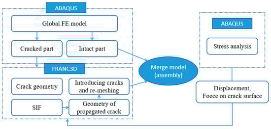 Pressure hull is usually curved structure, which is more complex than ship structures. The development of finite element analysis technology saves us analysis time. In this example, the combination of ABAQUS [58] and FRANC3D [59] is applied for analysis. Figure 11 shows the joint simulation procedure. The finite element model is established by ABAQUS. The meshing is conducted as well as the constraints and load conditions applied to generate model file which can be imported into the FRANC3D. FRANC3D provides a substructure method, which divides the concerned area into sub-models, and keeps the relationship between the sub-model and the global model, as shown in Figure 12, thus reducing the calculation time. When the initial crack is introduced into the sub-model, re-meshing will be done. The sub-model with initial crack will be automatically merged with the intact part and submitted to ABAQUS for calculation for the corresponding stress intensity factors along the crack front. The crack front is renewed by selecting growth criterion as UFLP, the crack morphology can be obtained which will be the basis of the fatigue life assessment.