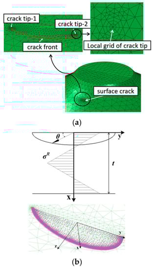 (a) The location and meshing of the introduced crack; (b) the distribution of residual stresses on crack surface [57].
