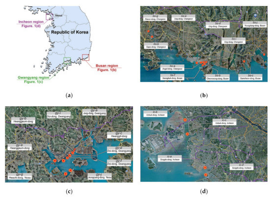 Sampling locations: (a) the regions in Korea; (b) the Busan region; (c) the Gwangyang region; (d) the Incheon region.