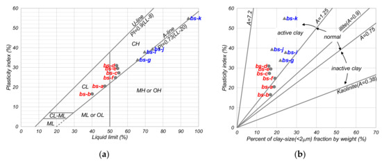 The characteristics of dredged soil in the Busan region were analyzed using 10 samples, and are shown as plasticity and activity charts in Figure 2a,b, respectively. The specific gravity, plastic limit, liquid limit, plastic index, and activity of the samples were 2.706–2.731 (average 2.718), 20.88–39.31 (avg. 28.97%), 40.10–94.26% (avg. 60.74%), 15.56–54.96% (avg. 31.77%), and 0.8–2.29 (avg. 1.63), respectively. The specimens bs-g, bs-i, bs-j, and bs-k followed the A-line on the plasticity chart, and other specimens showed liquid limits (LL) in the range of 40–55% (LL < 60%). The specimens in the Busan region can be separated into bs-a to bs-f (LL < 60%) and bs-g to bs-k (LL ≥ 60%), according to the liquid limit. It can be observed from Figure 2b that specimens with LL less than 60% represent a contented clay mineral with a PI (plasticity index) range of 10–20%, and the specimens with LL greater than 60% represent activated clay with a PI range of 33–55%. According to the sieve and particle size analysis tests, the sand particle content (less than the No. 200 sieve, 0.074 mm), silt particle content, and clay particle content were 0.62–5.07%, 72.90–82.93%, and 16.05–24.53%.
