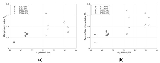 Consolidation properties of Gwangyang region soil: (a) liquid limit (LL)-compression index (Cc); (b) liquid limit (LL)-permeability change index (Ck).