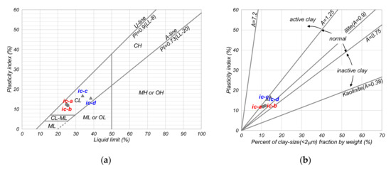 Physical properties of Gwangyang region soil: (a) Plasticity chart; (b) Activity chart.