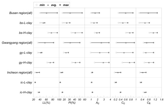 Furthermore, the Incheon region soil had different physical and compressive properties that were separated by the criteria of LL = 30% compared to the Busan and Gwangyang clays (LL = 60%). The ic-c and ic-d specimens with LL ≥ 30% had large fine particles, large compressibility, and small permeability compared to the ic-a and ic-b specimens with LL < 30%. Therefore, the Incheon region dredged soil can be separated reasonably using the criteria of liquid limit (LL = 30%). The clay with LL < 30% was named the Incheon-L marine clay and the clay with LL ≥ 30% was named the Incheon-H marine clay. Engineering properties of the marine soft soil were classified by liquid limits and are summarized in Figure 8.