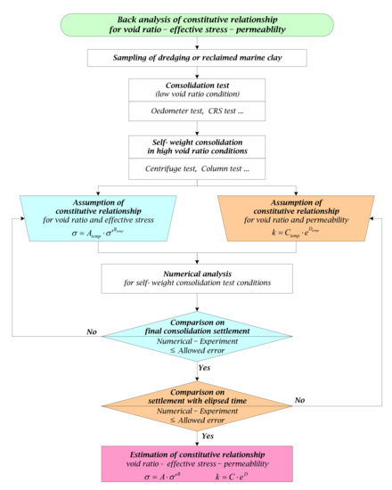 The dredged-reclaimed clay with a high void ratio should be estimated using finite strain consolidation theory due to huge deformations. The finite strain consolidation is suitable to analyze large deformations, considering the variation in the compressibility and permeability of clay as per effective stress. The variation in compressibility and permeability depend on the relationship void ratio (e)–effective stress (σ’)–permeability coefficient (k) during analysis, and this relationship is called the constitutive relationship of finite strain consolidation theory [13,14]. The constitutive relationship between void ratio–effective stress and void ratio–permeability is examined in this section to choose a suitable constitutive relationship equation in Korea.