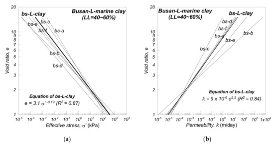 Constitutive relationship of Busan L marine clay (bs-L-clay): (a) void ratio vs. effective stress; (b) void ratio vs. permeability.