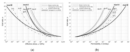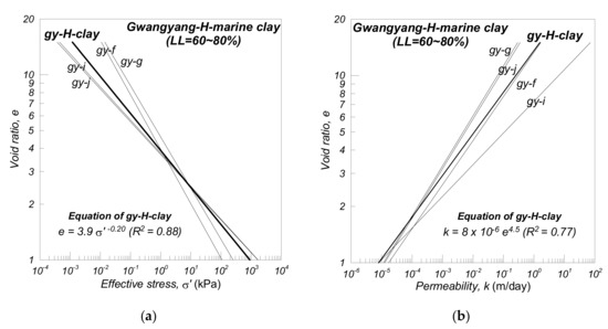 Constitutive relationship of Gwangyang H marine clay (gy-H-clay): (a) void ratio vs. effective stress; (b) void ratio vs. permeability.