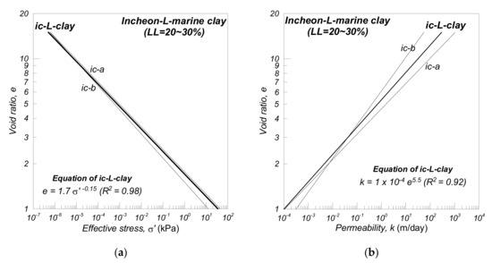 Constitutive relationship of Incheon L marine clay (ic-L-clay): (a) void ratio vs. effective stress; (b) void ratio vs. permeability.