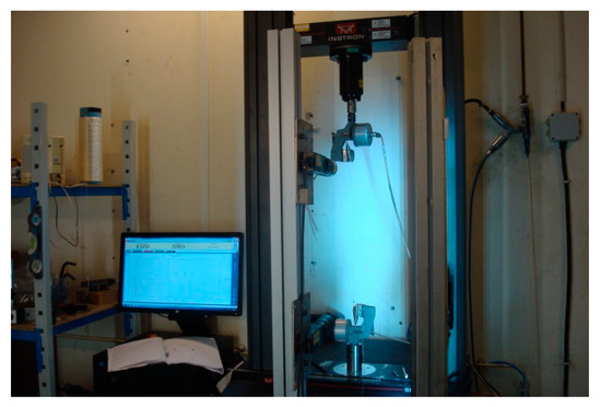 First, tensile tests were performed on rope yarns in order to examine the behaviour of one of the basic rope elements. These consisted of two hybrid yarns twisted together, as displayed in Figure 2. The yarns were gripped in special pneumatic grips and pulled to failure on an Instron™ 5966 tensile test machine (Figure 3), at a loading rate of 50 mm/min.