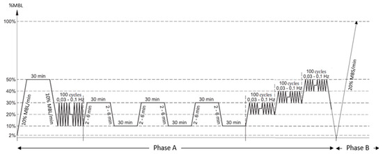 A standard test procedure, based on the ISO 18692:2007(E) guidance [19] for pure polyester ropes, was implemented as shown in Figure 5. This test protocol can be divided into Phase A and Phase B as shown in Figure 5 and Table 4. Each phase provides significant information for rope characterisation: Phase A informs the rope stiffness and Phase B quantifies the rope strength.