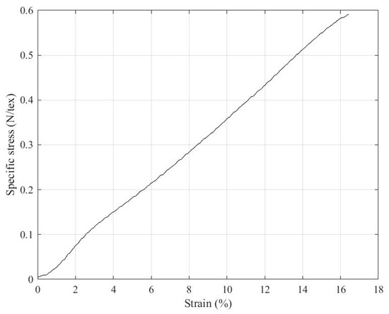 Figure 6 shows an example of the stress-strain response of a single hybrid yarn. Stress is calculated as force normalised by linear density in tex (g/km).