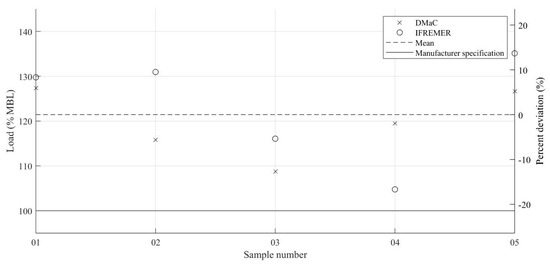 It can be seen that all samples at both facilities exceeded the break load specified by the manufacturer, some by up to 35%. Variance for break test measurements is lower at IFREMER than that at DMaC, as seen in Figure 10.