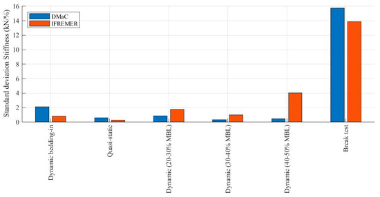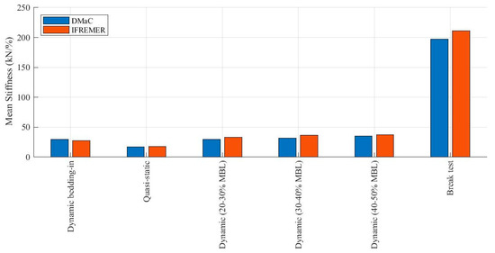 The percentage deviation of dynamic stiffness values for the three specified dynamic load ranges (20–30% MBL, 30–40% MBL and 40–50% MBL) can be seen in Figure 9. The mean values for the dynamic stiffness are 31.4 kN/%, 34.5 kN/% and 37.5 kN/% for each load range, respectively. These values are calculated from Test 01 to Test 05a, for both DMaC and IFREMER (Test 05b is not included).